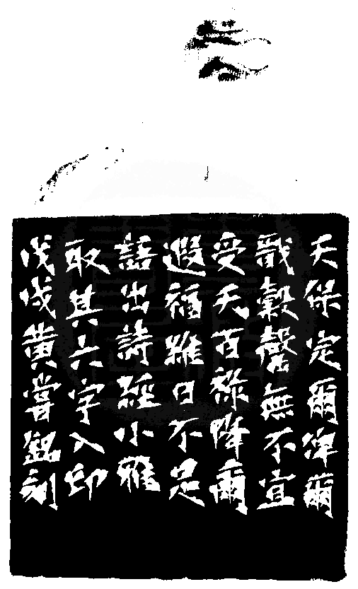黃嘗銘.六十五歲/刻〔受天百祿遐幅〕正方加框白文印。邊款為【天保定爾,俾爾戩穀。罄無不宜,受天百祿。降爾遐福,維日不足。語出詩經小雅,取其六字入印。戊戌,黃嘗銘刻。】老撾石。獸鈕。