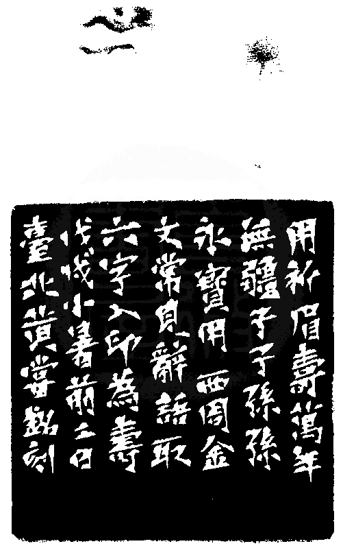 黃嘗銘.六十五歲/刻〔用祈眉壽萬年〕正方朱文印。邊款為【用祈眉壽,萬年無疆,子子孫孫永寶用。西周金文常見辭語,取六字入印為壽。戊戌小暑前二日,臺北黃嘗銘刻。】老撾石。獸鈕。