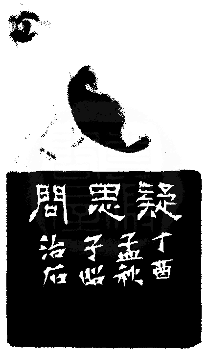 黃嘗銘.六十四歲/刻〔疑思問〕長方加框白文印。邊款為【疑思問。丁酉孟秋,子昭治石。】芙蓉石。獸鈕。