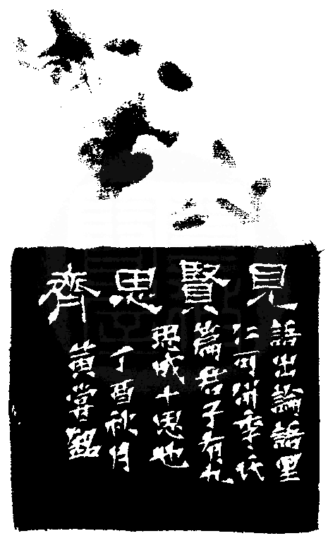 黃嘗銘.六十四歲/刻〔見賢思齊〕長方白文縱格印。邊款為【見賢思齊。語出《論語.里仁》,可併《季氏篇》君子有九思成十思也。丁酉秋月,黃嘗銘。】芙蓉石。獸鈕。