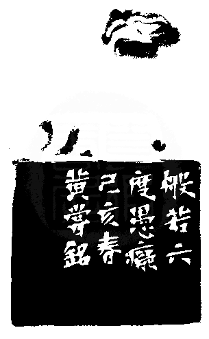 黃嘗銘.六十六歲/刻〔般若〕長方朱文印。邊款為【般若六度愚癡。己亥春,黃嘗銘。】老撾田石。獸鈕。