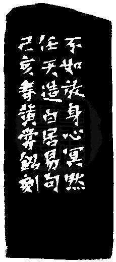 黃嘗銘.六十六歲/刻〔心任天造〕長方白文印。邊款為【不如放身心,冥然任天造。白居易句。己亥春,黃嘗銘刻。】昌化雞血石。自然頂。