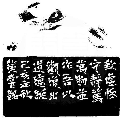 黃嘗銘.六十六歲/刻〔致虛守靜以觀其復〕正方加框白文印。邊款為【致虛極,守靜篤。萬物並作,吾以觀復。出《道德經》。己亥立秋,黃嘗銘。】老撾田黃。獸鈕。