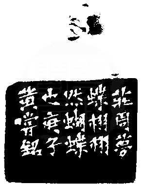 黃嘗銘.六十七歲/刻〔栩栩然〕長方朱文印。邊款為【莊周夢蝶,栩栩然蝴蝶也。庚子,黃嘗銘。】老撾田黃石。獸鈕。