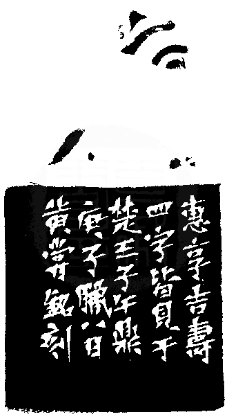 黃嘗銘.六十七歲/刻〔惠享吉壽〕正方朱文印。邊款為【惠享吉壽。四字皆見于楚王子午鼎。庚子臘八日,黃嘗銘刻。】老撾北礦黃白石。獸鈕。