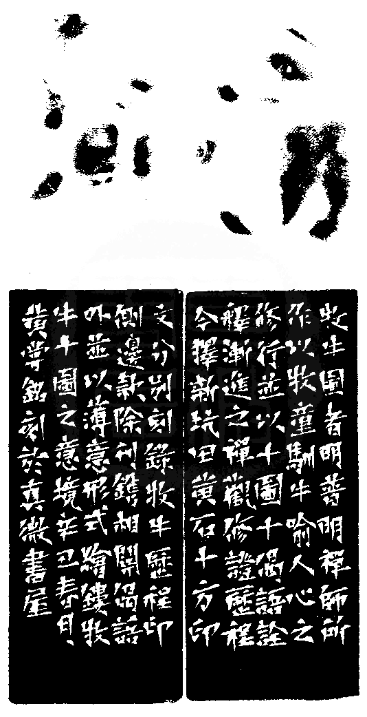 黃嘗銘.六十八歲/刻〔牧牛圖〕正方朱文印。邊款為【《牧牛圖》者乃明普明禪師所作,以牧童馴牛喻人心之修行,並以十圖十偈語詮釋漸進之禪觀修證歷程。今擇新坑老撾田黃石十方,印面分別刻錄牧牛歷程,印側邊款除刻鐫相關偈語外,並以薄意形式繪鏤牧牛十圖之意境。辛丑春月,黃嘗銘刻於真微書屋。】老撾田黃石。牧牛鈕。