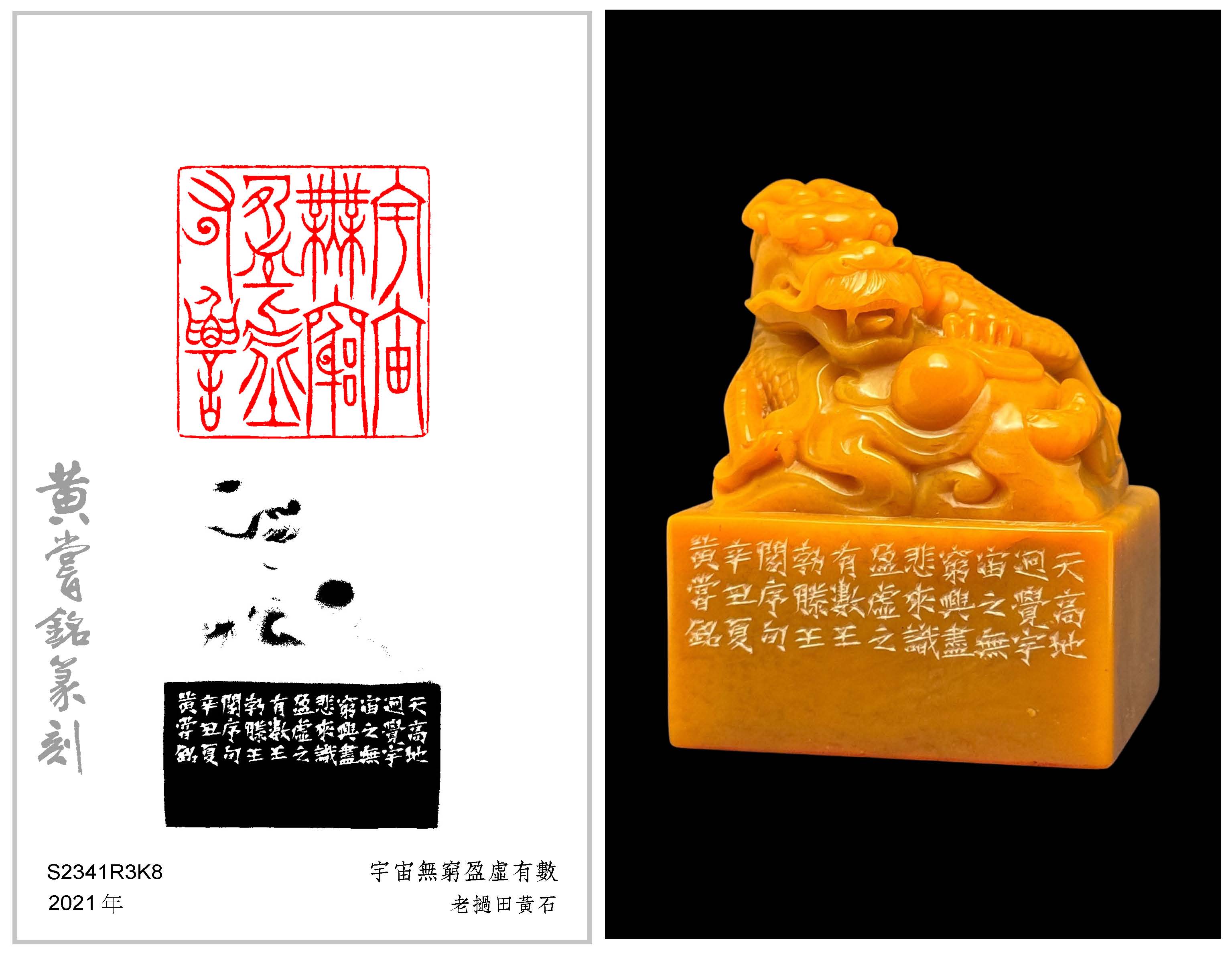 黃嘗銘.六十八歲/刻〔宇宙無窮盈虛有數〕長方朱文印。邊款為【天高地迥,覺宇宙之無窮;興盡悲來,識盈虛之有數。王勃《滕王閣序》句。辛丑夏,黃嘗銘。】老撾田黃石。龍鈕。