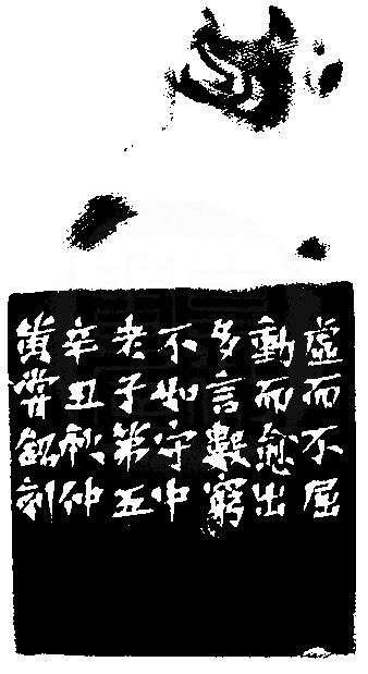 黃嘗銘.六十八歲/刻〔守中〕長方朱文印。邊款為【虛而不屈,動而愈出。多言數窮,不如守中。《老子》第五。辛丑秋仲,黃嘗銘。】老撾田黃石。古獸鈕。