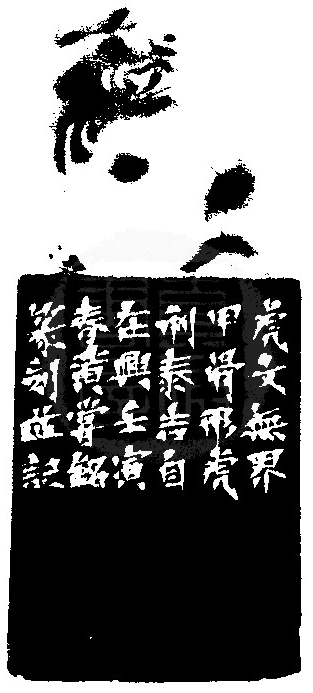 黃嘗銘.六十九歲/刻〔虎〕長方白文印。邊款為【虎文無界甲骨形,虎利泰吉自在興。壬寅春,黃嘗銘篆刻並記。】老撾北黃石。獸鈕。