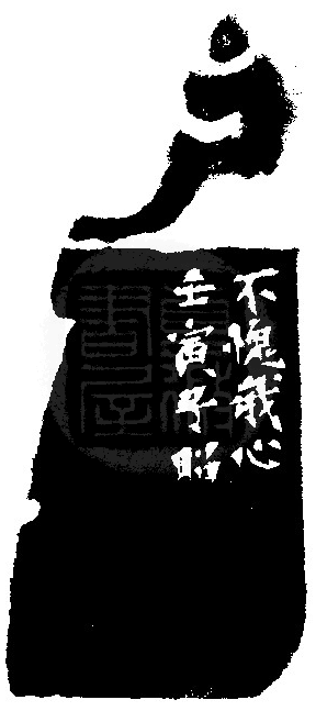 黃嘗銘.六十九歲/刻〔不愧〕自然形朱文印。邊款為【不愧我心。壬寅,子昭。】老撾北黃白凍石。獸鈕。