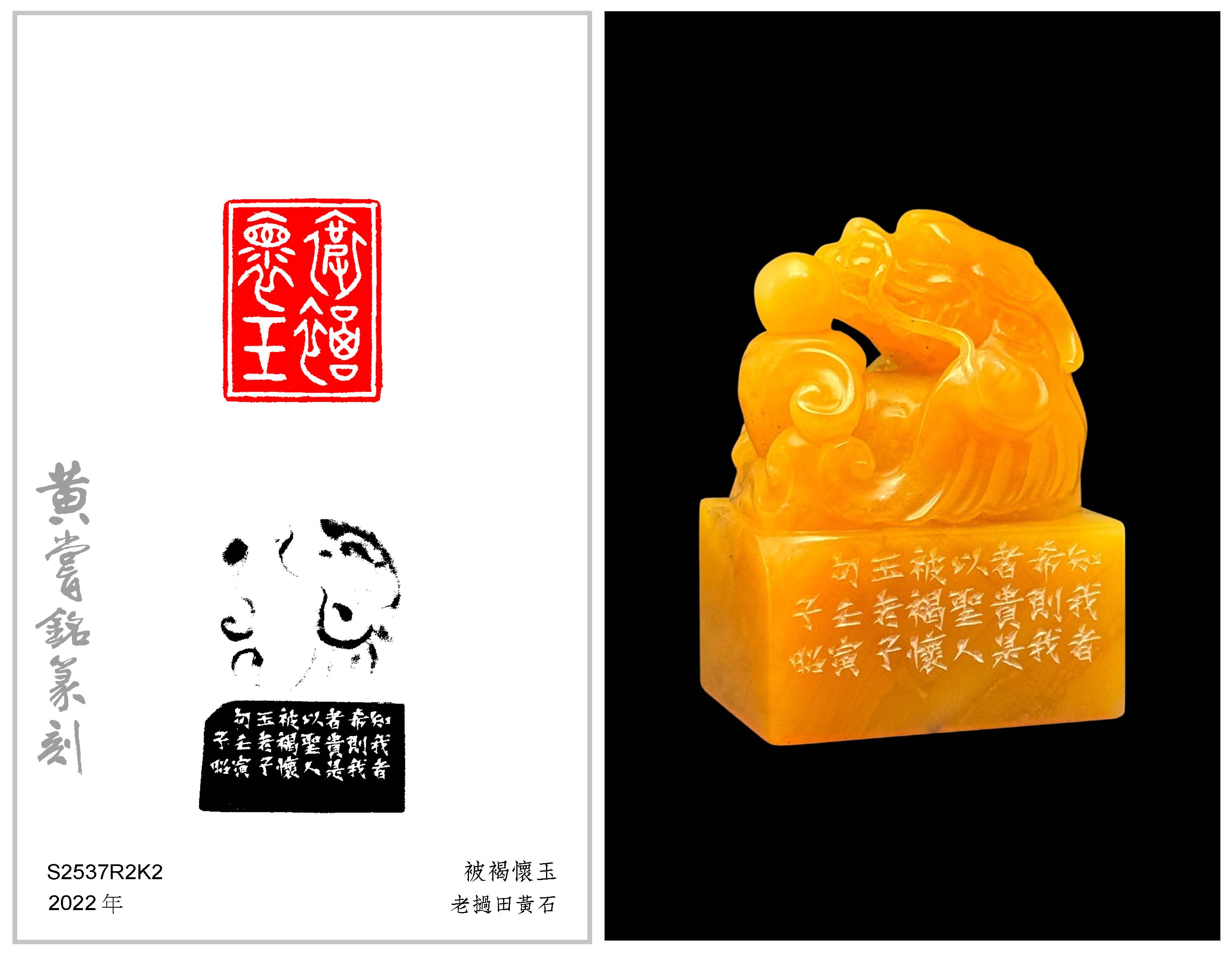 黃嘗銘.六十九歲/刻〔被褐懷玉〕長方加框白文印。邊款為【知我者希,則我者貴。是以聖人被褐懷玉。老子句。壬寅,子昭。】老撾田黃石。鰲龍戲珠鈕。