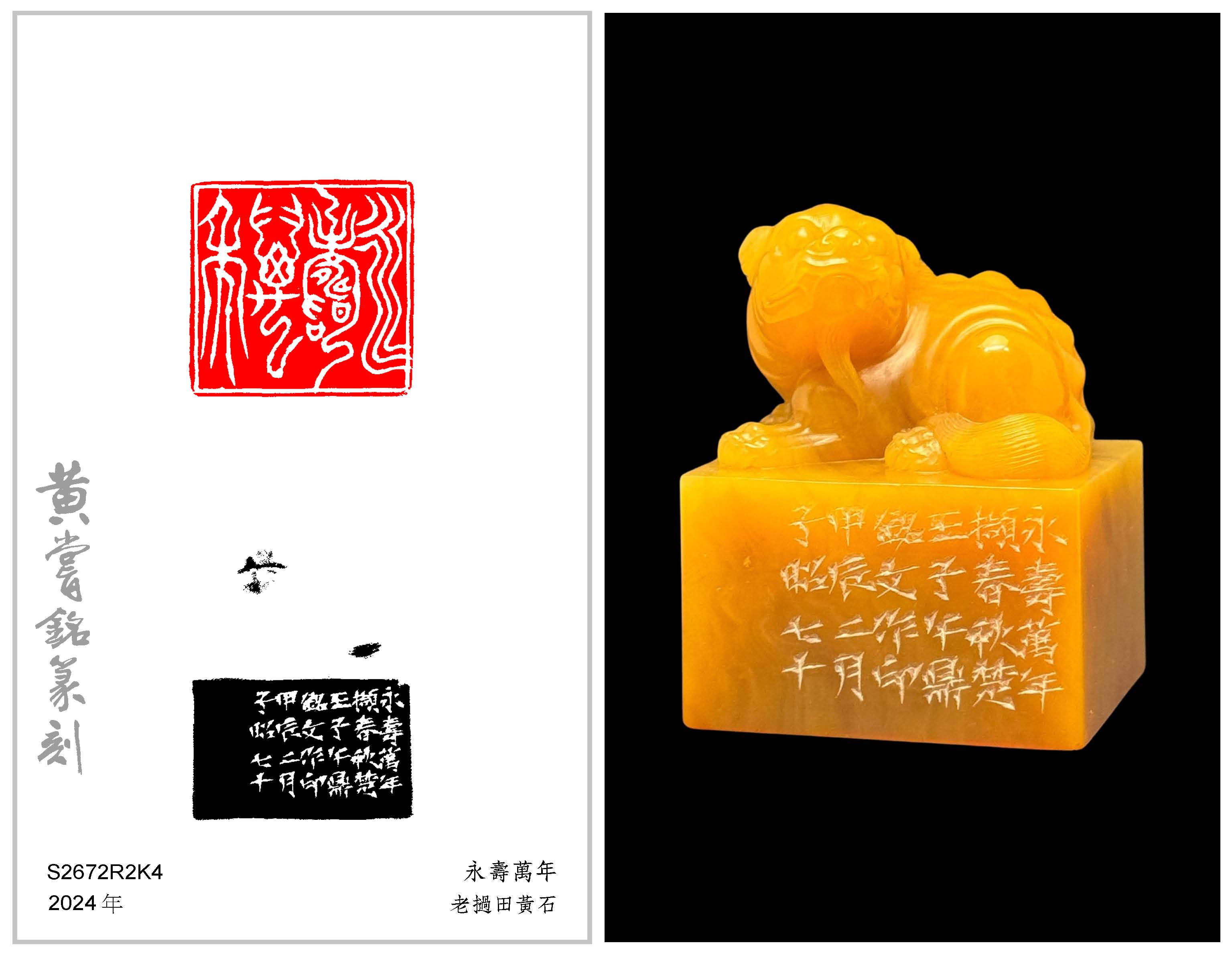 黃嘗銘.七十一歲/刻〔永壽萬年〕正方加框白文印。邊款為【永壽萬年。擷春秋楚王子午鼎銘文作印。甲辰二月,子昭七十。】老撾田黃石。古獸鈕。