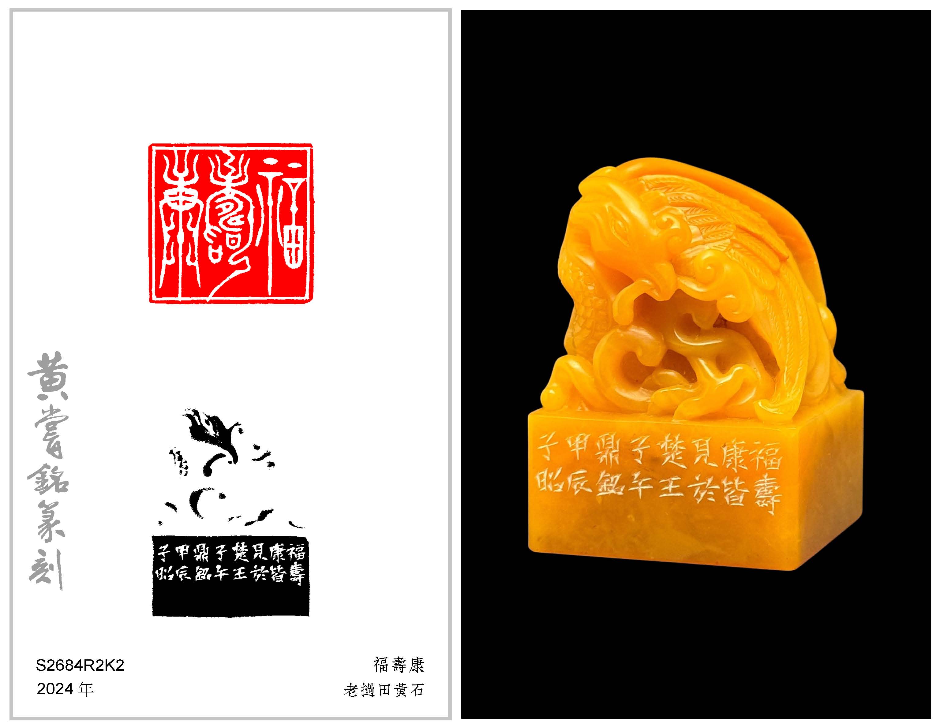 黃嘗銘.七十一歲/刻〔福壽康〕正方加框白文印。邊款為【福壽康皆見於楚王子午鼎銘。甲辰,子昭。】老撾田黃石。鳳鈕。  2024 年刻