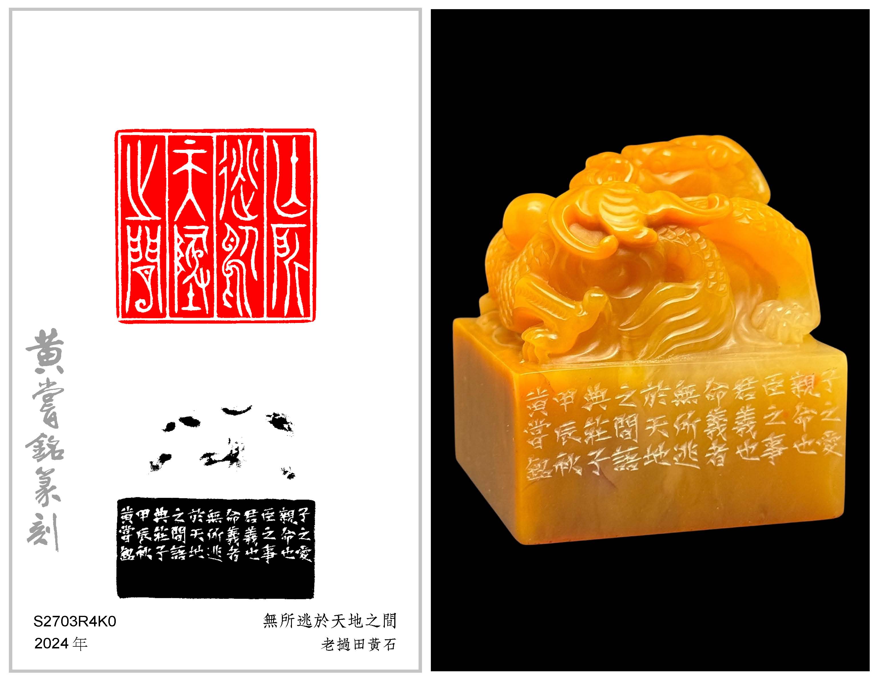 黃嘗銘.七十一歲/刻〔無所逃於天地之間〕正方白文縱格印。邊款為【子之愛親,命也;臣之事君,義也。命義者,無所逃於天地之間。語典莊子。甲辰秋,黃嘗銘。】老撾田黃石。龍蝠鈕。  2024 年刻