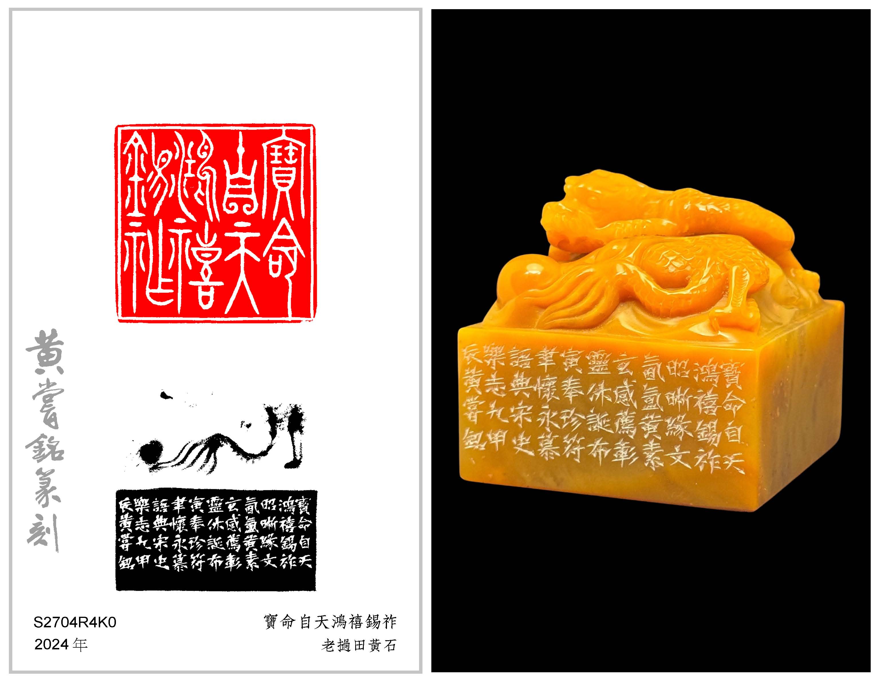 黃嘗銘.七十一歲/刻〔寶命自天鴻禧錫祚〕正方加框白文印。邊款為【寶命自天,鴻禧錫祚。昭晰緣文,氤氳黃素。玄感薦彰,靈休誕布。寅奉珍符,聿懷永慕。語典《宋史樂志九》。甲辰,黃嘗銘。】老撾田黃石。龍珠鈕。  2024 年刻